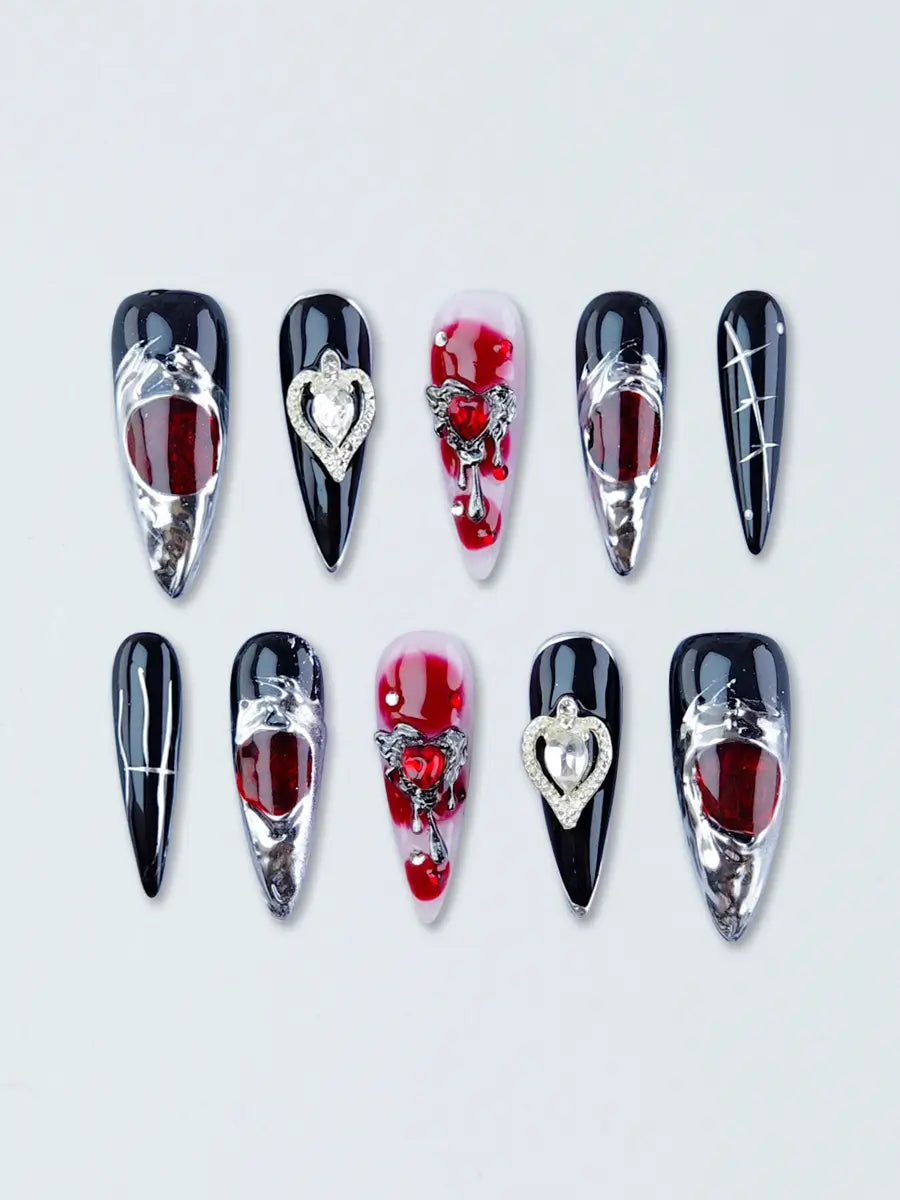Black Red Gothic Stiletto Nails with Metal Heart Charms
