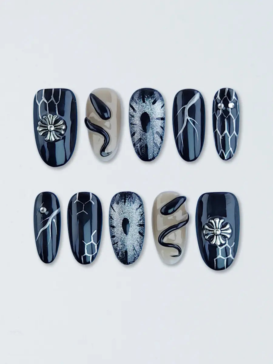 Black Snake Print Metal Cross Press-On Nails – Dark Aesthetic Medium Round