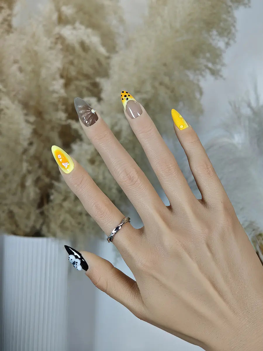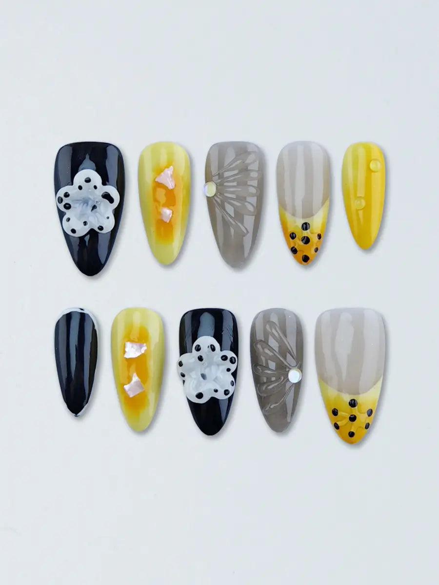 Black Yellow Gray Press-On Nails – 3D Flower & Shell Luxury Almond Shape
