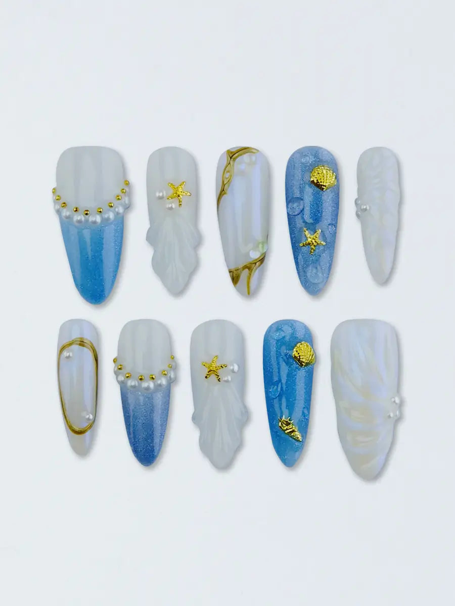 Blue & White Ocean-Inspired Almond Press-On Nails with 3D Pearls & Starfish Accents