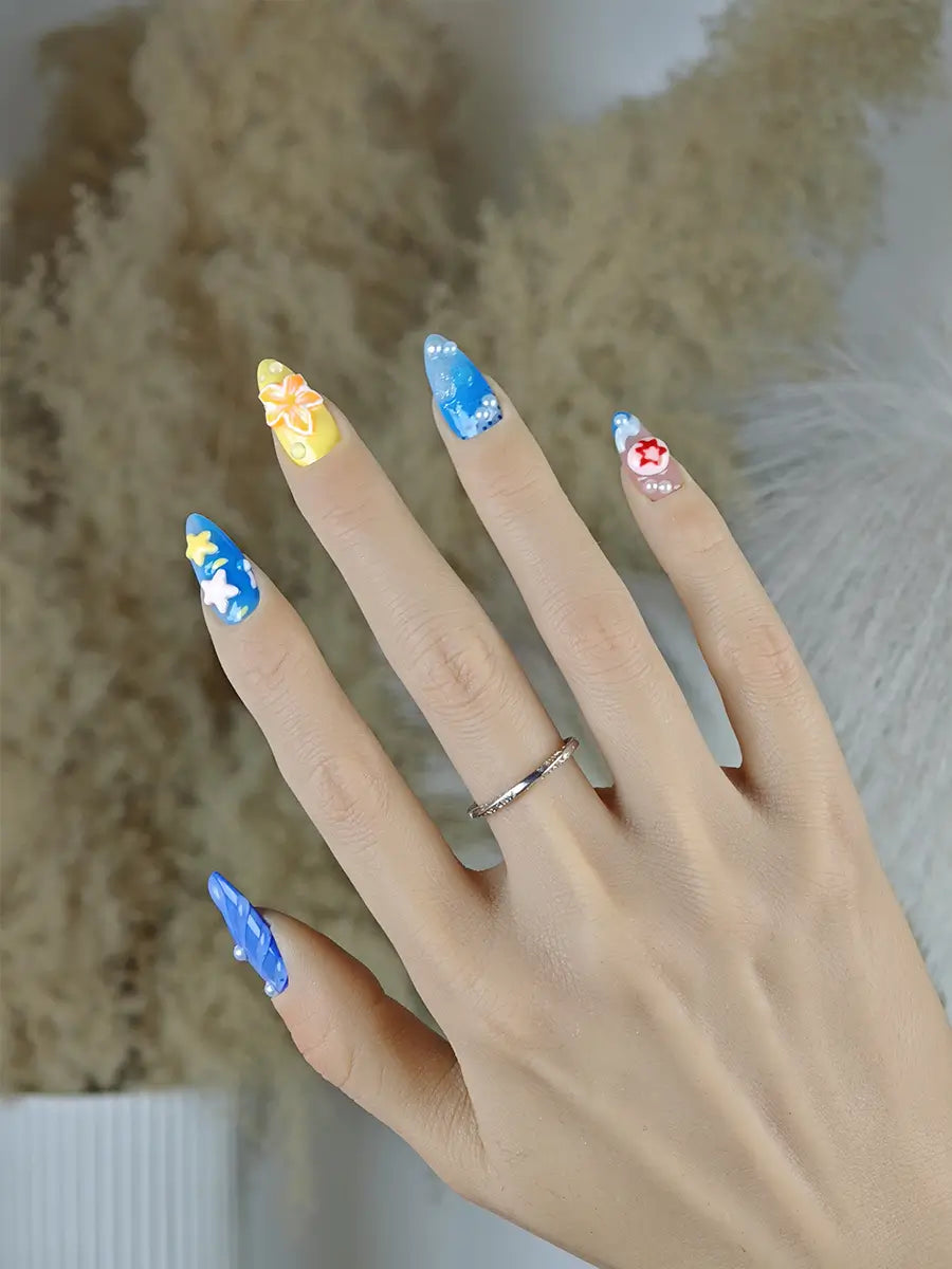 Blue & Yellow Ocean Style Press-On Nails – 3D Floral & Pearl Design