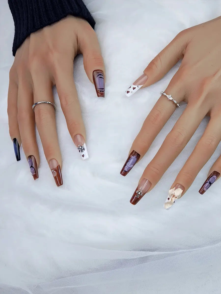 Brown Purple Contrast Press-On Nails – Extra Long Luxury 3D Floral & Metal Cross