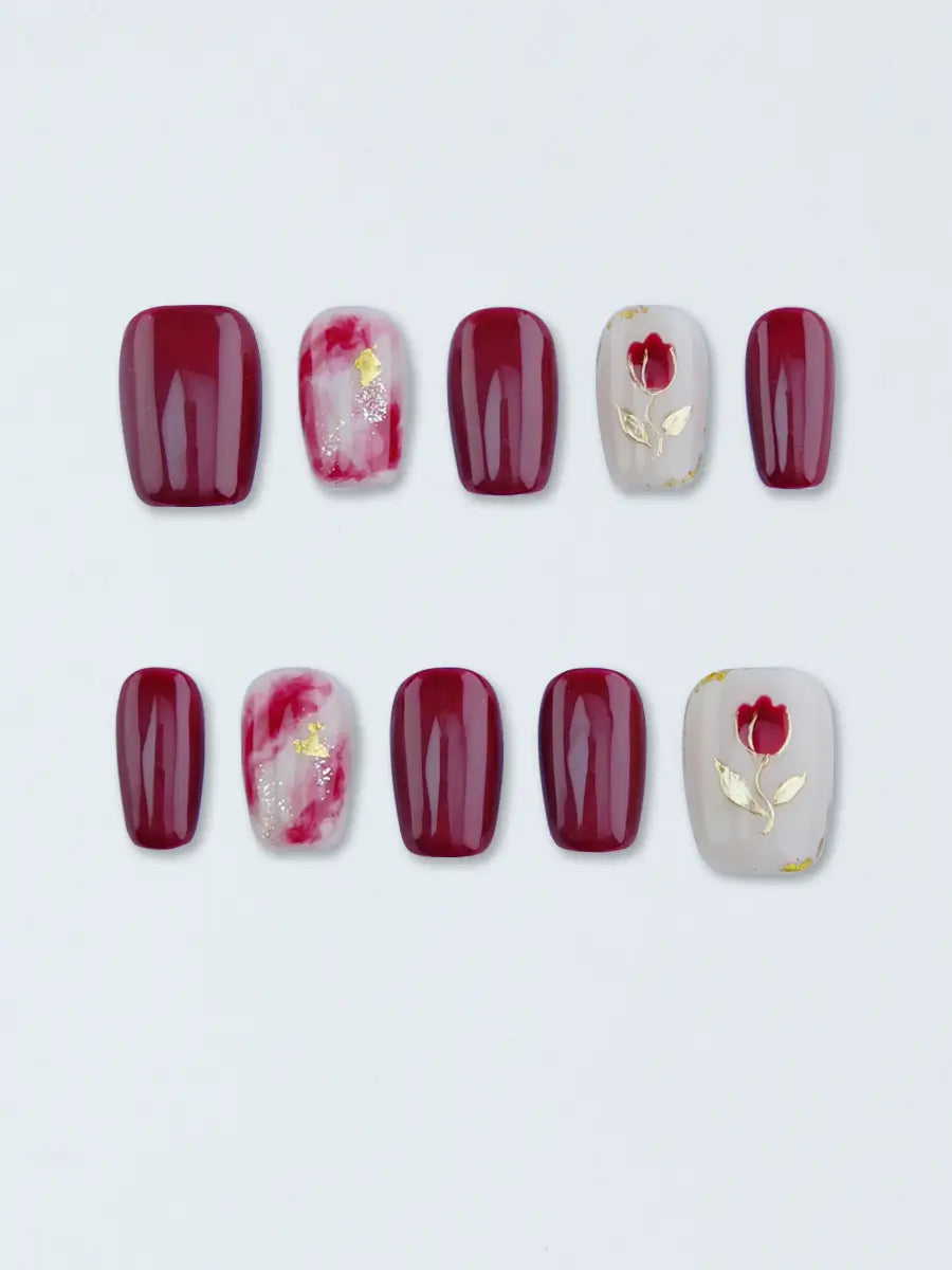 Burgundy Gold Hand-Painted Floral Art Press-On Nails