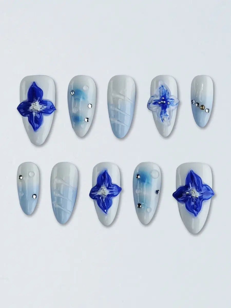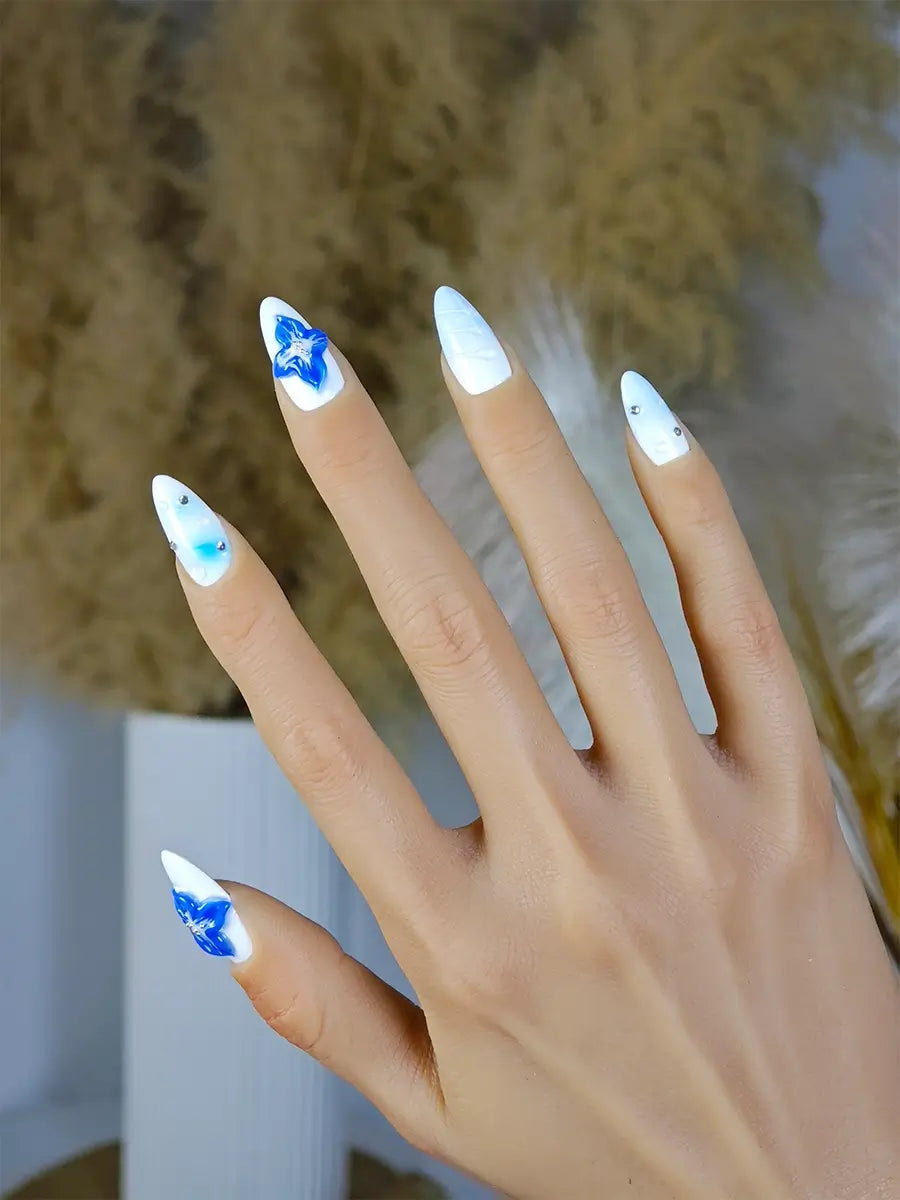 White & Navy Almond Press On Nails with 3D Floral Carving Ocean Breeze Aesthetic