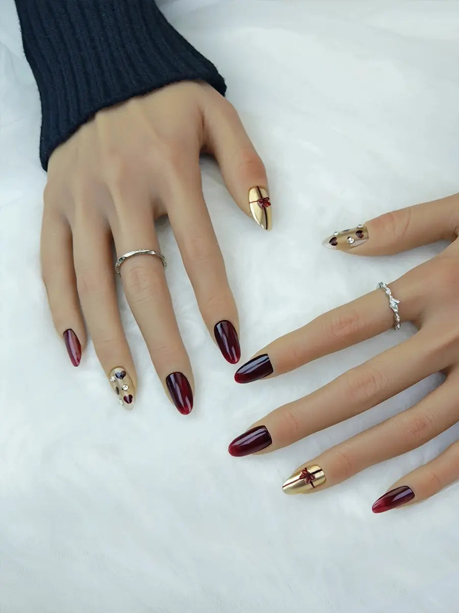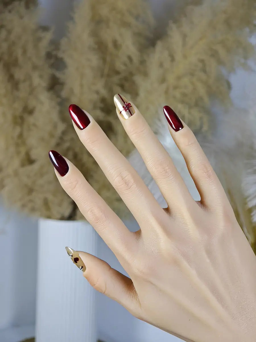 Wine Red Gold Gift Box Press-On Nails – Sweet Girl Medium Round